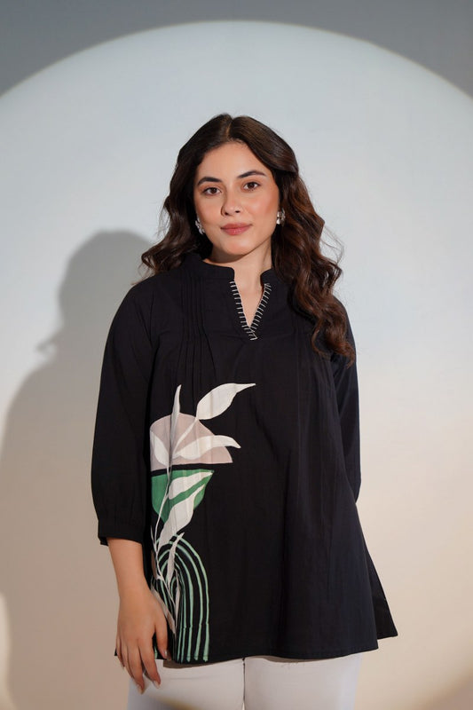 WOMEN'S BLACK COTTON SHIRT – BRUSH PAINT FLORAL DESIGN