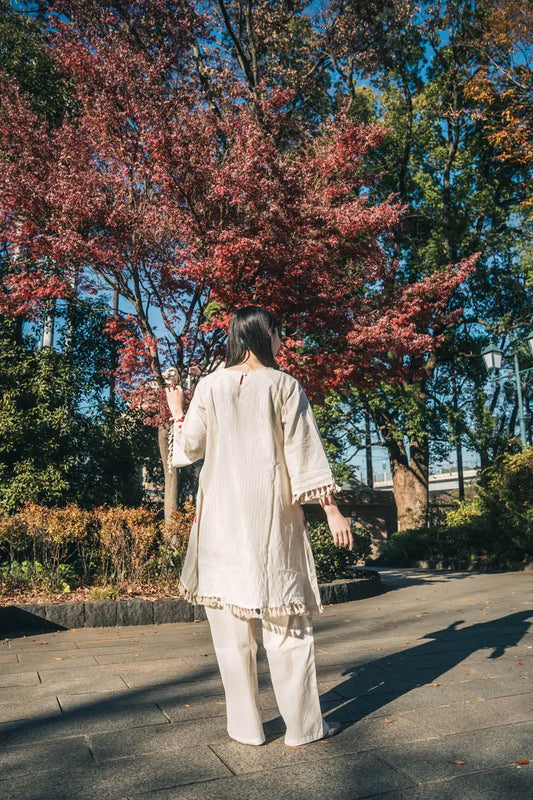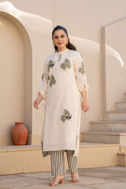 WOMEN'S IVORY COTTON EMBROIDERED KURTA SET WITH STRIPED PANTS