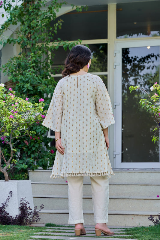 Elegant Cotton Hand Paint Co-Ords Set – Off White with Floral Motif & Geometric Border