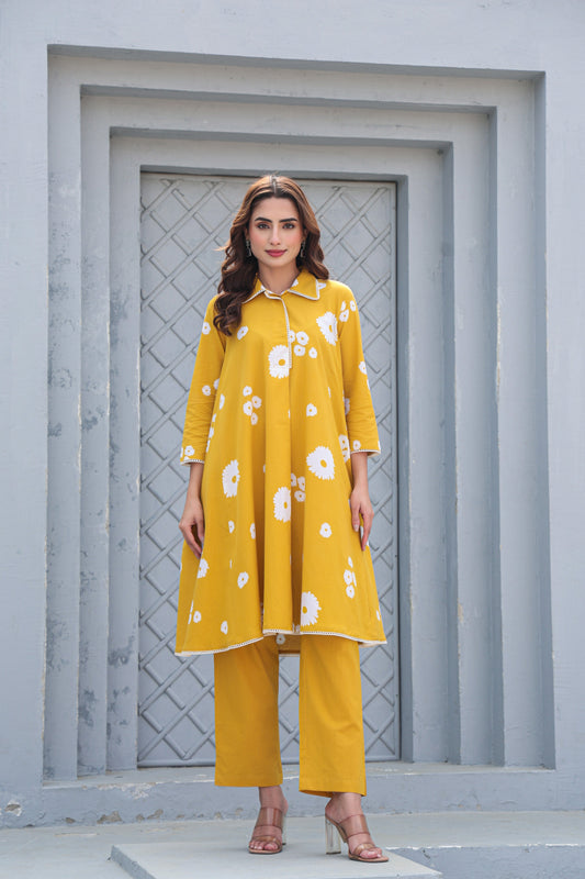 MUSTARD YELLOW FLORAL COTTON CO-ORDS SET A-LINE KURTA & PANTS | SUMMER ETHNIC OUTFIT FOR WOMEN