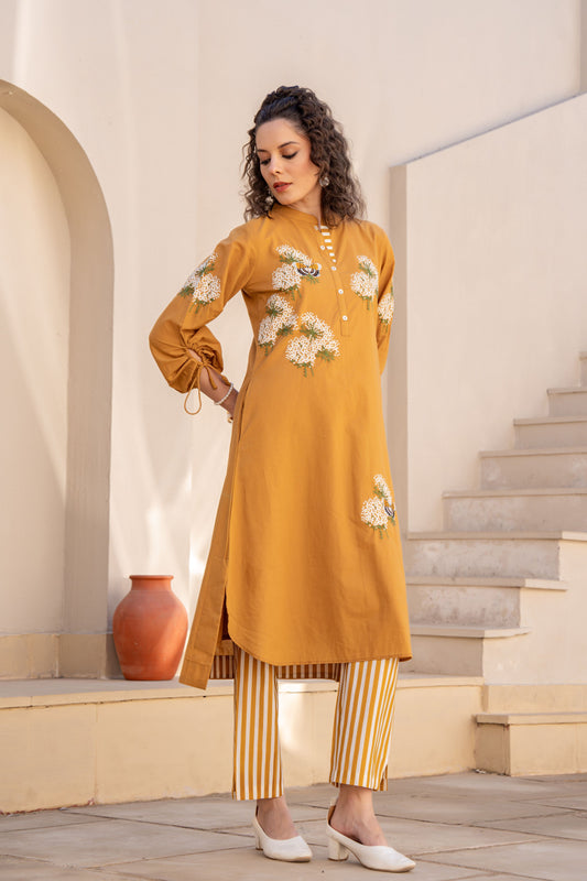 WOMEN'S MUSTARD COTTON EMBROIDERED KURTA SET WITH STRIPED PANTS