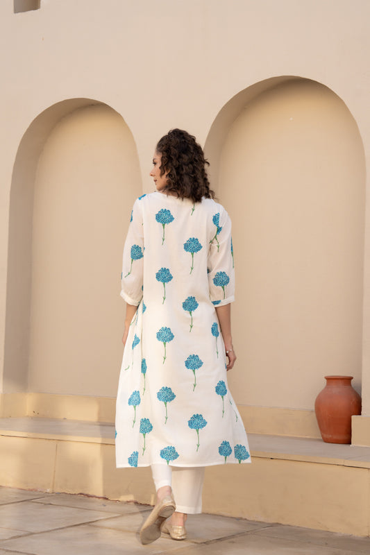 WHITE & BLUE FLORAL PRINTED COTTON CO-ORDS SET FOR WOMEN ELEGANT STRAIGHT KURTA WITH PANTS | EVERYDAY ETHNIC WEAR