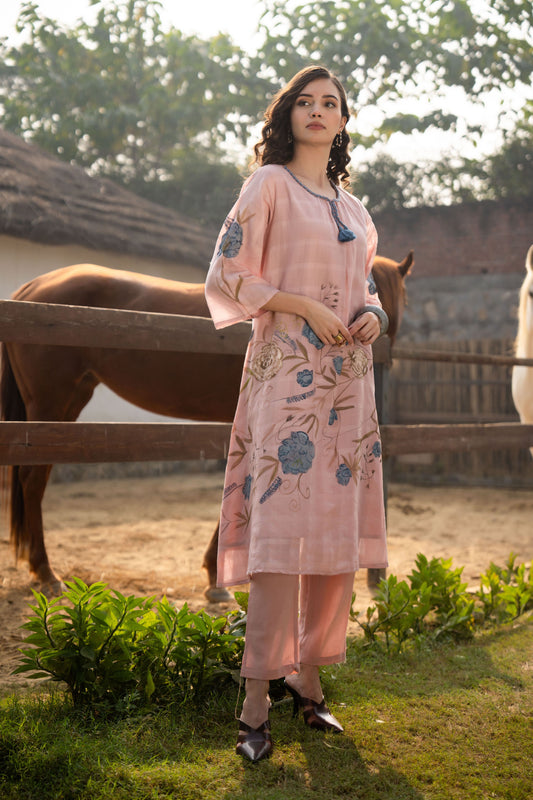 BLUSH PINK MAL COTTON HAND-PAINTED FLORAL KURTA SET WITH PANTS ELEGANT SUMMER ETHNIC WEAR FOR WOMEN