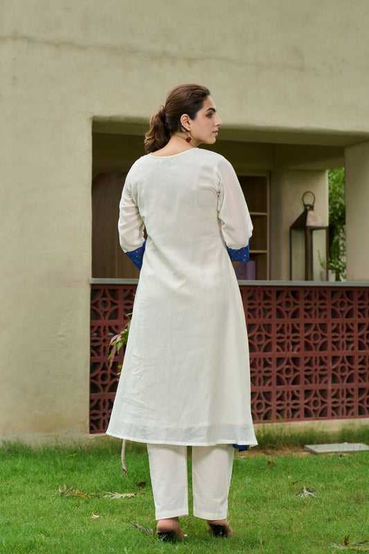Off White & Navy Blue Embroidered Cotton Co-ord Set for Women – Stylish Ethnic Top & Pant Set