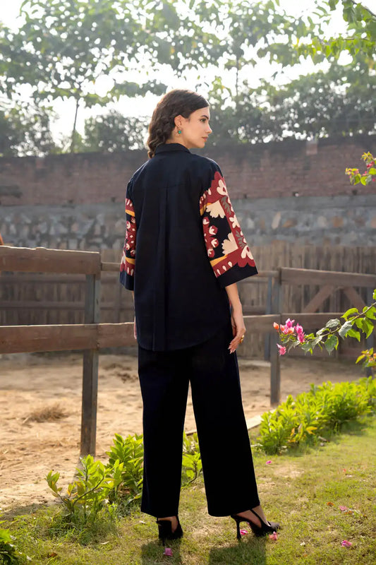 BLACK FLORAL COTTON CO-ORDS SET FOR WOMEN STYLISH A-LINE KURTA WITH PANTS | SUMMER ETHNIC WEAR