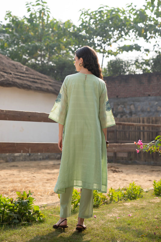 BLUSH GREEN MAL COTTON HAND-PAINTED FLORAL KURTA SET WITH PANTS ELEGANT SUMMER ETHNIC WEAR FOR WOMEN