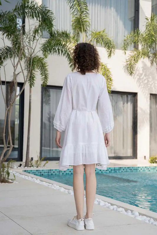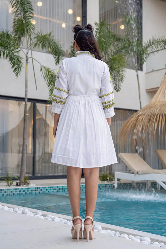 WHITE FLORAL EMBROIDERED SHORT COTTON DRESS