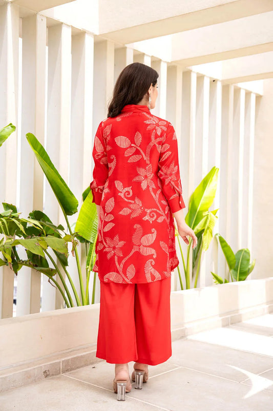 RED FLORAL EMBROIDERED STRAIGHT KURTA SET WITH PALAZZO PANTS