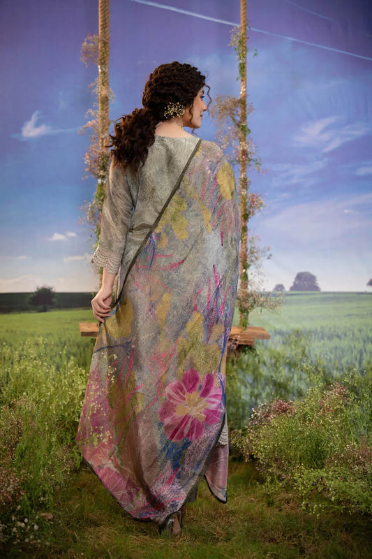 GREY EMBROIDERED KURTA WITH FLORAL DUPATTA & PANTS