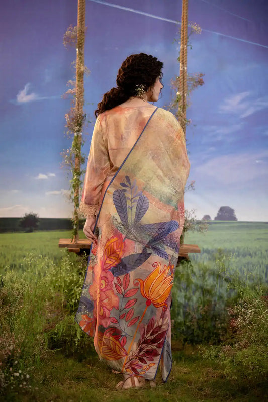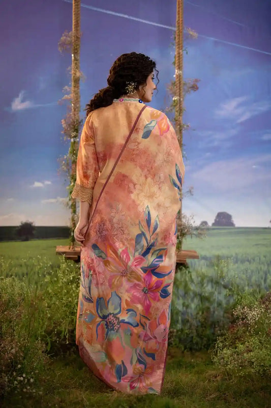 FLORAL PRINTED PEACH SHIMMER TISSUE KURTA WITH STRAIGHT PANTS AND DUPATTA