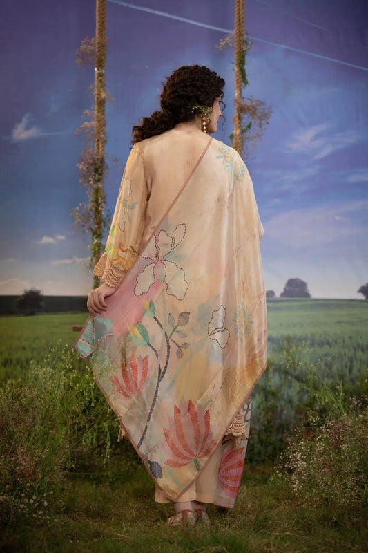 PEACH FLORAL PRINT SHIMMER TISSUE KURTA SET WITH DUPATTA