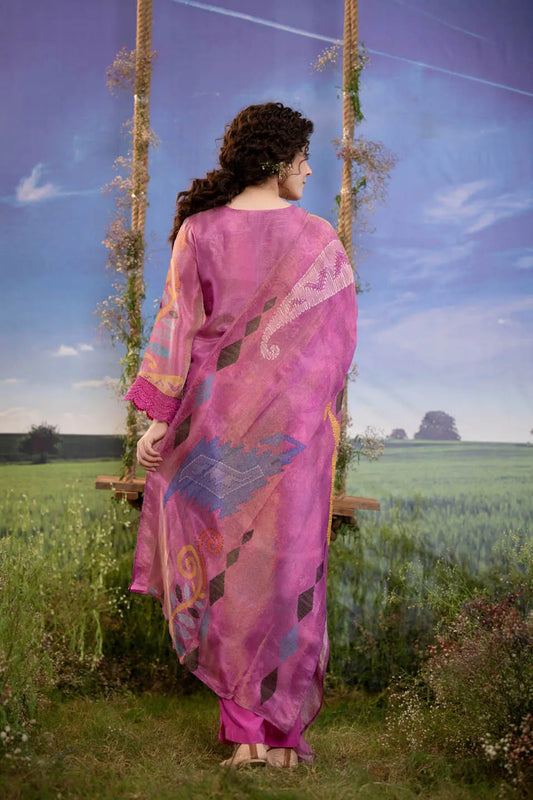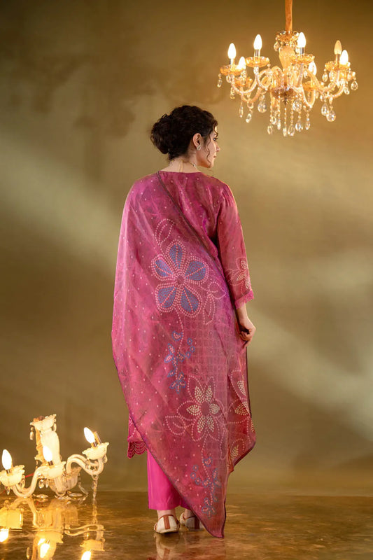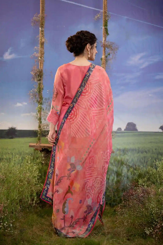 PINK FLORAL PRINT SHIMMER TISSUE KURTA SET WITH DUPATTA