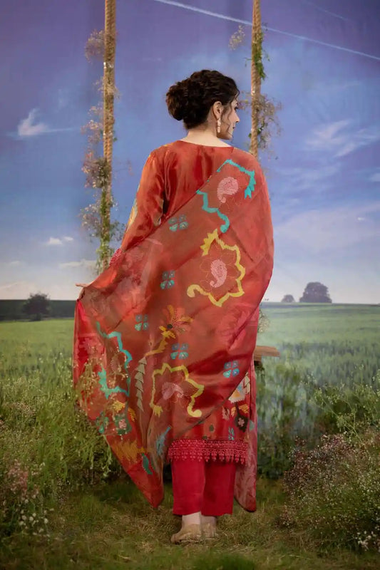 RUST RED GEOMETRIC PRINT SHIMMER TISSUE KURTA SET WITH DUPATTA