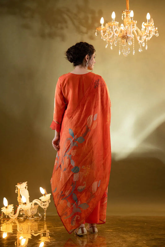 FESTIVE ORANGE EMBELLISHED KURTA SET WITH FLORAL DUPATTA & STRAIGHT PANTS