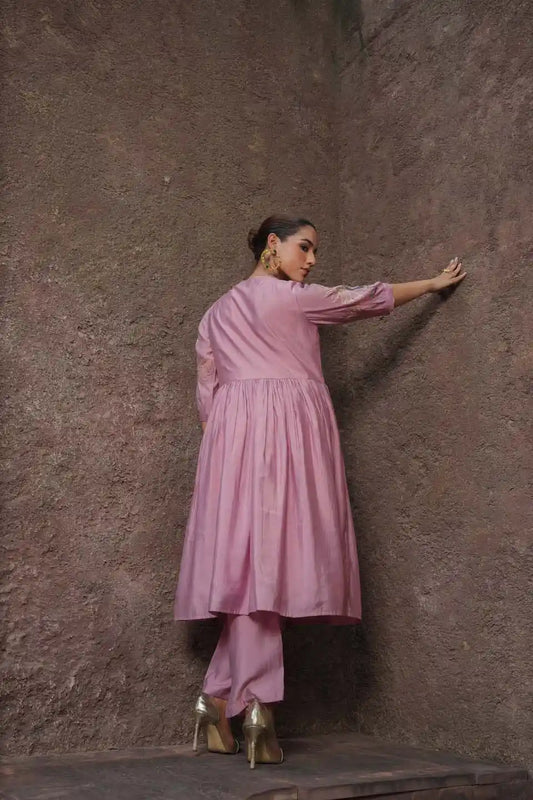 LAVENDER FLORAL EMBROIDERED A-LINE KURTA WITH STRAIGHT PANTS SET