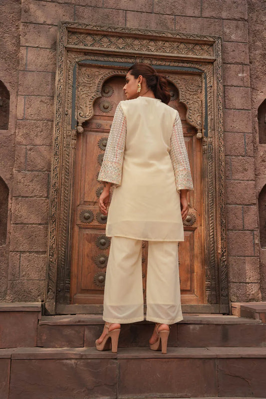 OFF-WHITE EMBROIDERED ROMAN SILK KURTA WITH STRAIGHT PANTS SET