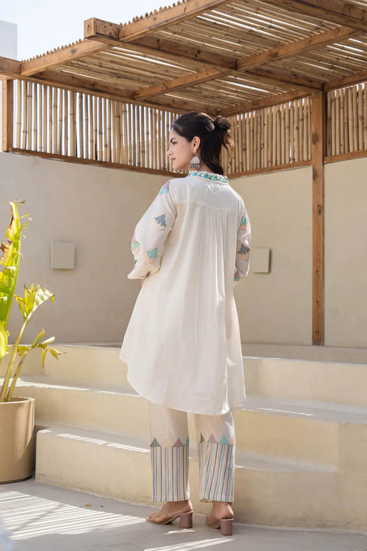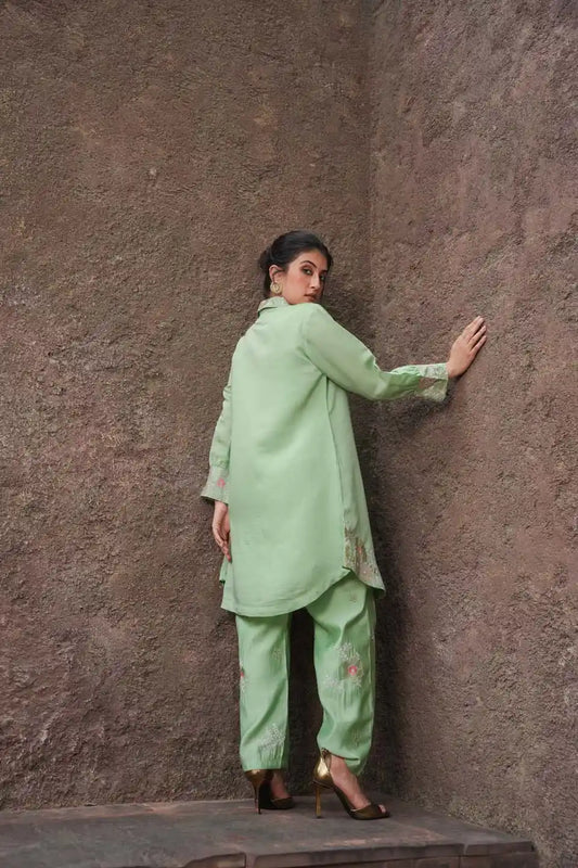 EMBROIDERED PASTEL COORDINATED SET: KNEE-LENGTH TOP WITH MANDARIN COLLAR AND STRAIGHT PANTS