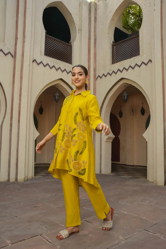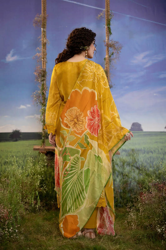 MUSTARD YELLOW SILK BLEND EMBELLISHED KURTA WITH FLORAL DUPATTA AND STRAIGHT PANTS - FESTIVE WEAR
