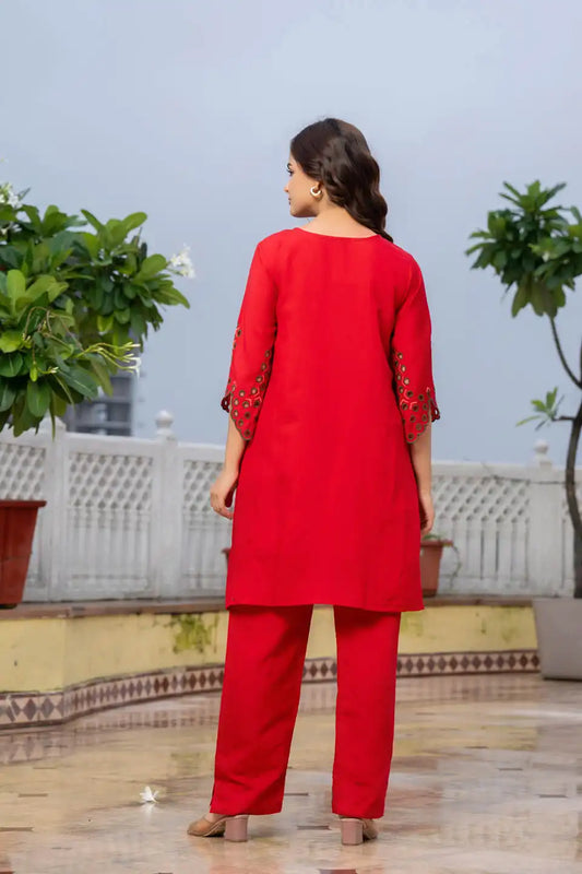 RED EMBROIDERED COORD SET WITH EYELET DETAILS