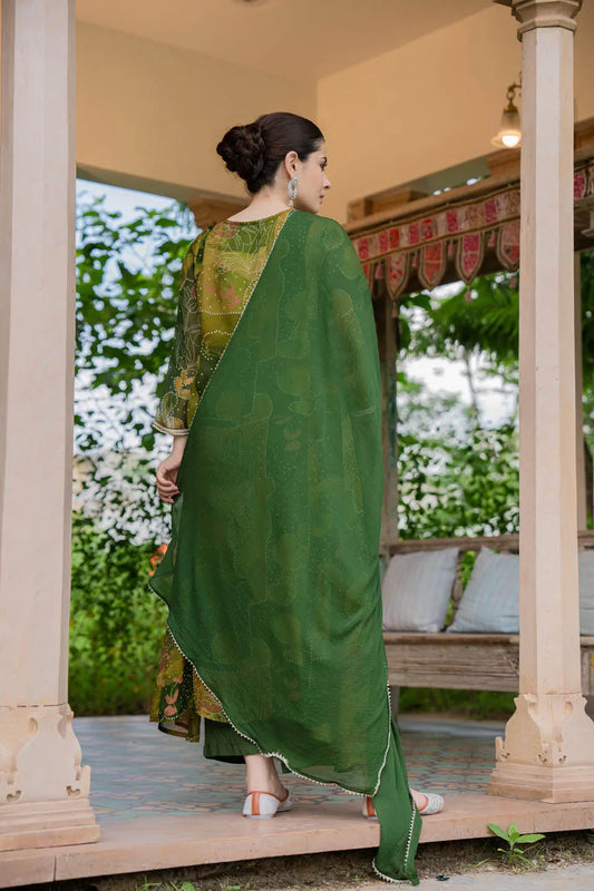 ELEGANT OLIVE GREEN A-LINE KURTA SET WITH EMBROIDERED V-NECK AND ABSTRACT FLORAL PRINT