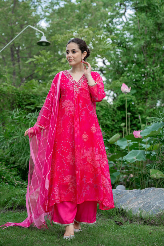 VIBRANT PINK/BLUE STRAIGHT KURTA SET WITH EMBROIDERED V-NECK AND FLORAL PAISLEY PRINT