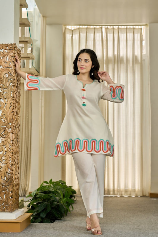 Off White & Navy Blue Embroidered Cotton Co-ord Set for Women – Stylish Ethnic Top & Pant Set